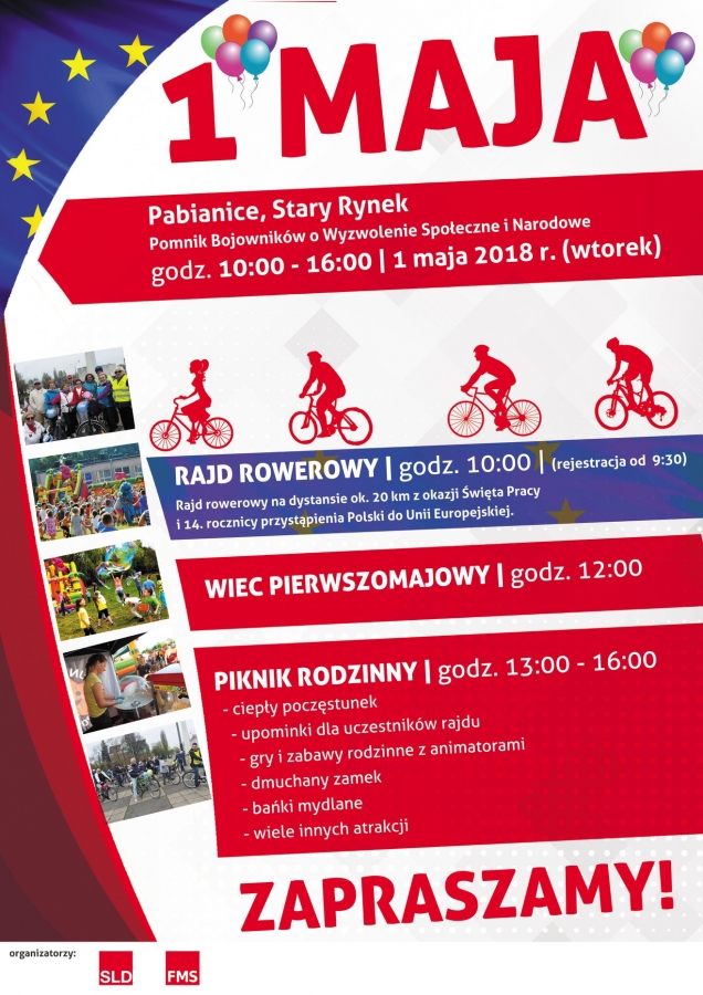 SLD w Pabianicach zaprasza z kolei na tradycyjny Rajd Rowerowy na dystansie ok. 20 km, który wystartuje o godz. 10:00 ze Starego Rynku w Pabianicach. Nie zabraknie też wiecu pierwszomajowego (godz.12:00) i Pikniku Rodzinnego z mnóstwem atrakcji, takich jak dmuchany zamek, bańki mydlane, gry i zabawy dla najmłodszych.